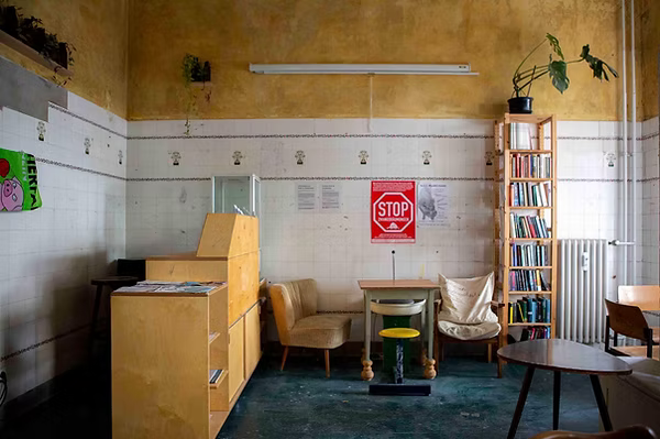 Die Eingangstür ist über eine Rampe im Aussenbereich zu erreichen und wird manuell geöffnet. Der Eingangsbereich ist vom Innenraum gut einsichtig sodass immer eine Person aufmerksam wird, wenn jemand vor der Eingangstür steht, und die Tür bei Bedarf öffnen kann. – Im Innenraum gibt es eine weitere Rampe, die den kleinen Höhenunterschied zwischen Vorderraum und Küche schwellenfrei überbrückt. – Zwischen Bibliothek und Siebdruckwerkstatt befindet sich eine Stufe. Die Stufe zur Siebdruckwerkstatt kann über eine Rampe vom Hof umgangen werden. – Der Brennofen der Keramikwerkstatt befindet sich im Keller und kann leider nur über eine Treppe erreicht werden.
